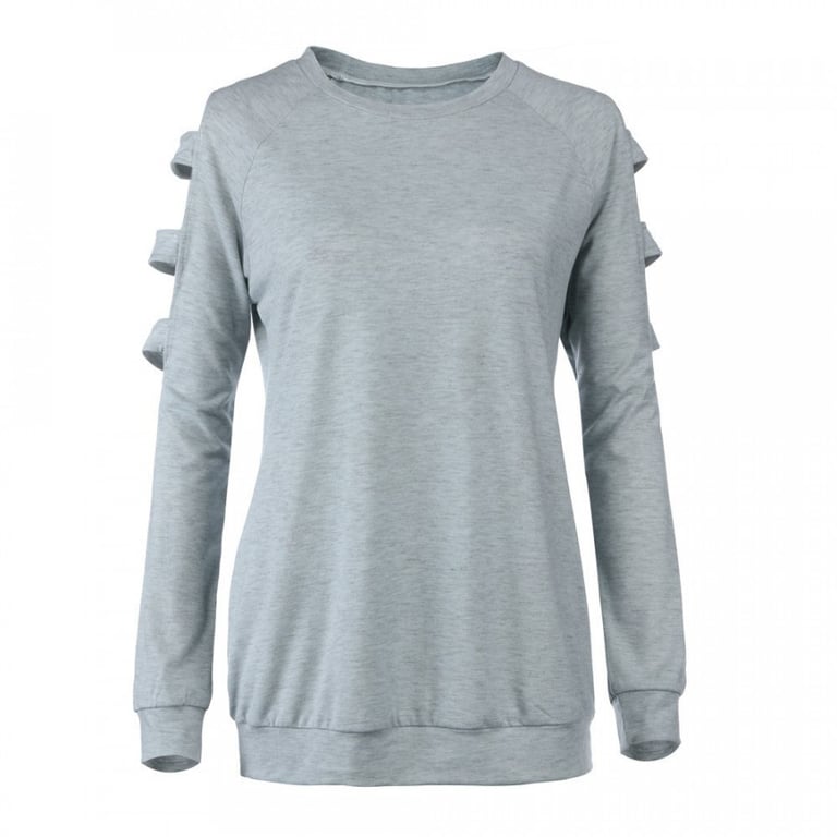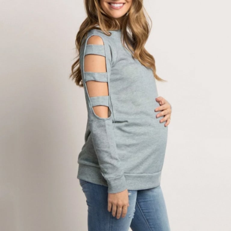 Women's loose-fitting maternity t-shirt. The t-shirt has a round neckline and long sleeves with cut-outs. Available in grey.