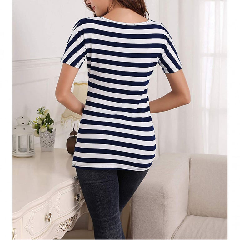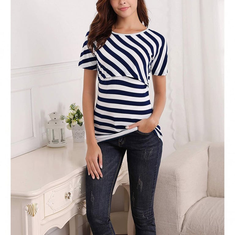Women's maternity t-shirt with short sleeves and a round neckline. Loose, comfortable fit. Striped pattern. Available in two variants.