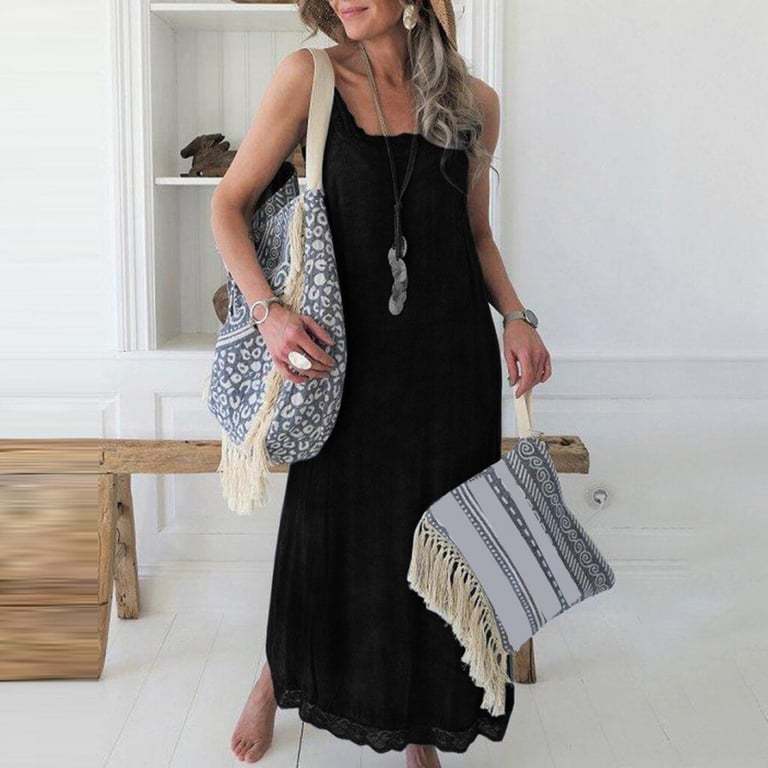 Women's long dress with spaghetti straps. Loose wide fit. Trimmed with subtle lace. Available in two colours.