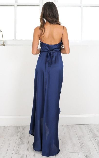 Women's maxi dress with a sexy slit in dark blue. The size chart shows the measurements of the product, not the body.