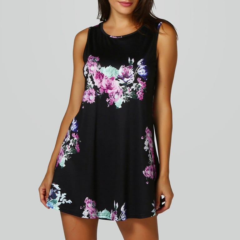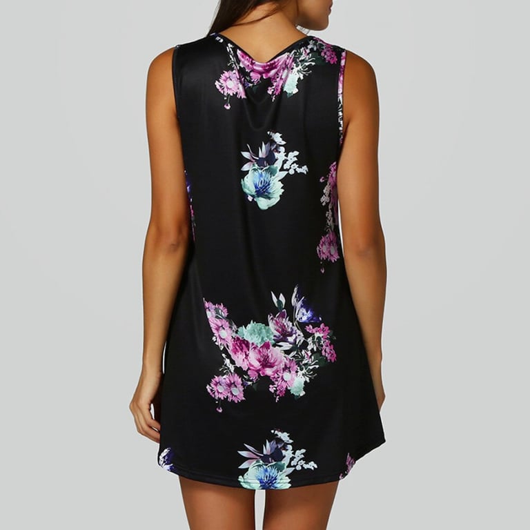 Women's short dress with a colourful floral print. Loose fit without sleeves and a round neckline. Available in multiple colour options.