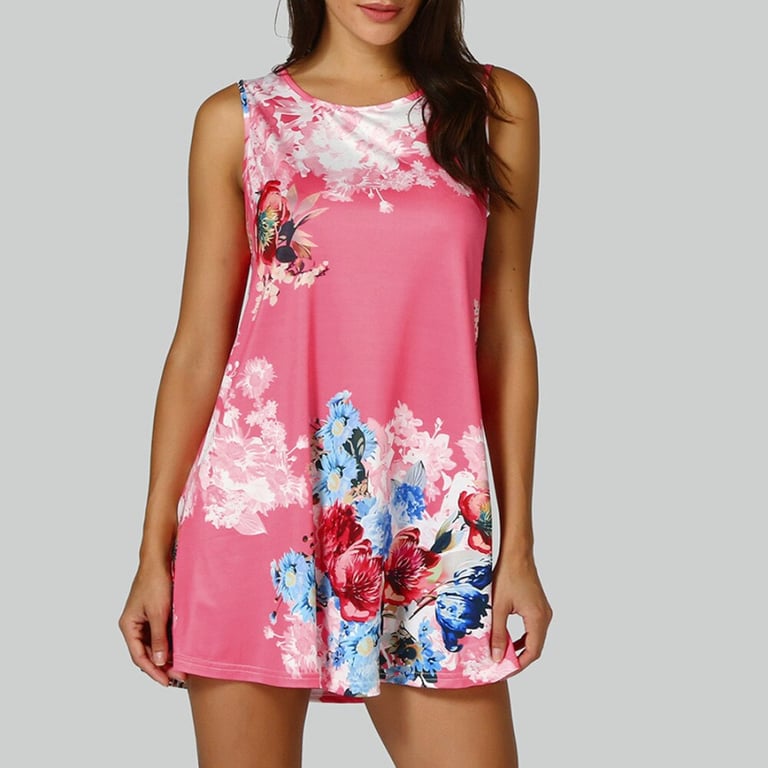 Women's short dress with a colourful floral print. Loose fit without sleeves and a round neckline. Available in multiple colour options.