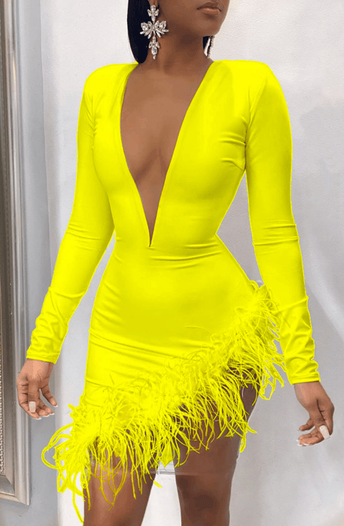 • Tags: dress, fitted dress, asymmetrical dress, mini dress, long sleeve dress, deep V-neck dress, women's dress, feather dress