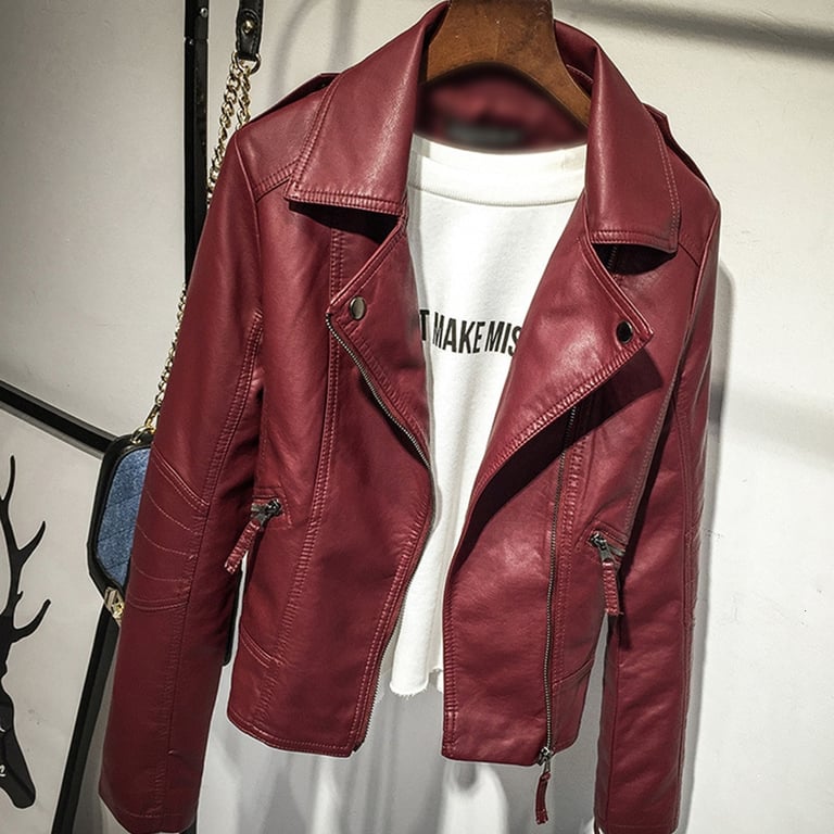 Women's modern biker-style jacket with a leather look. The jacket features a collar with lapels and a zip fastening. Two side zip pockets.