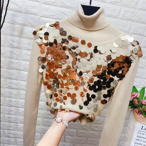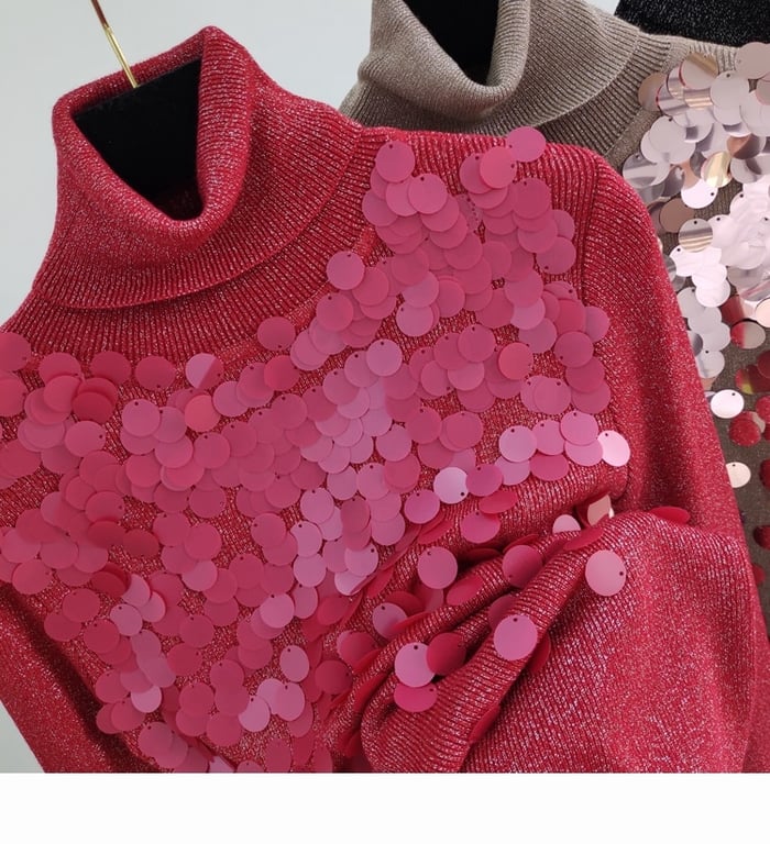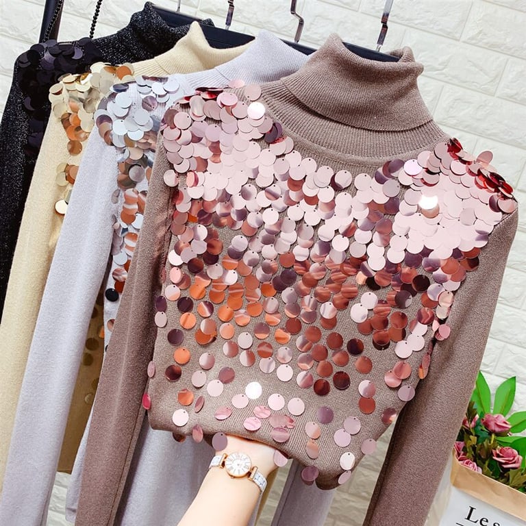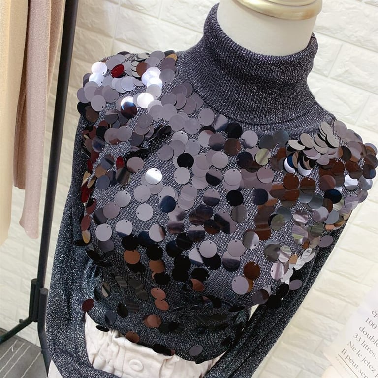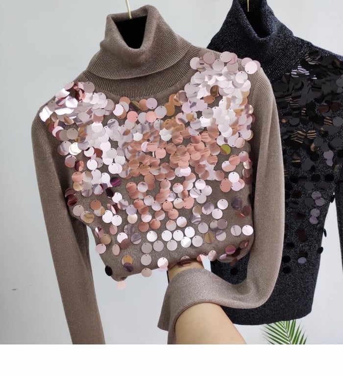 • It’s the large sparkling sequins that make this turtleneck an absolutely fascinating trendy outfit.