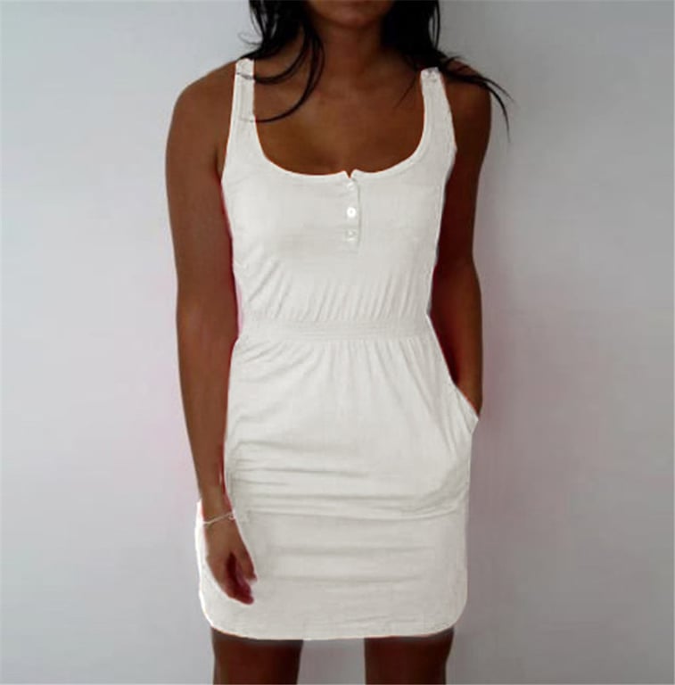 The dress is sleeveless, with straps, features an elastic waist, and has small buttons at the neckline. It is also complemented with pockets.
