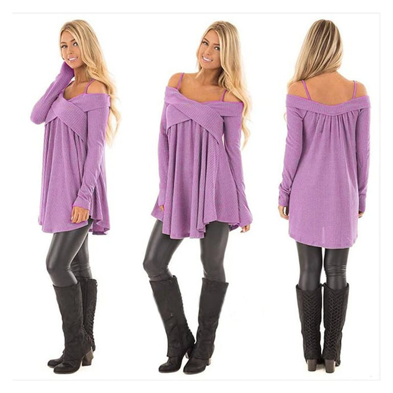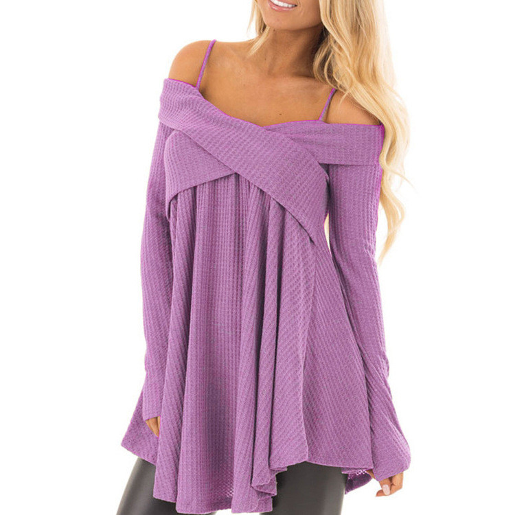 Women's loose-fitting sweater. The sweater has long sleeves and exposed shoulders with narrow straps. Available in several colour options.
