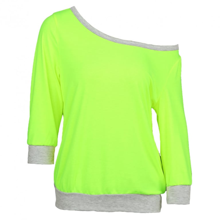 Women's long-sleeve t-shirt. The t-shirt features a round neckline with an exposed shoulder. Loose fit with an elastic waistband. Available in several variations.
