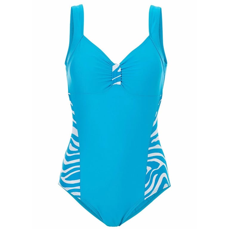 Women's one-piece swimsuit with wide straps and a back neckline. Delicate cutouts and decorative gathering at the bust. Sides with a zebra pattern. Plus size available. Available in two colour variants.