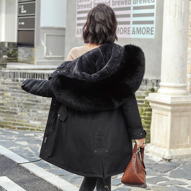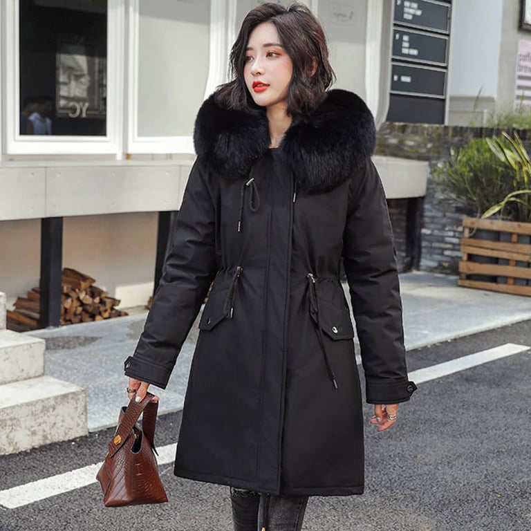 Women's winter parka with a hood and warm fur lining. The jacket has a loose long fit with an elastic drawstring at the waist. Side pockets. Insulated. Available in multiple colour options.