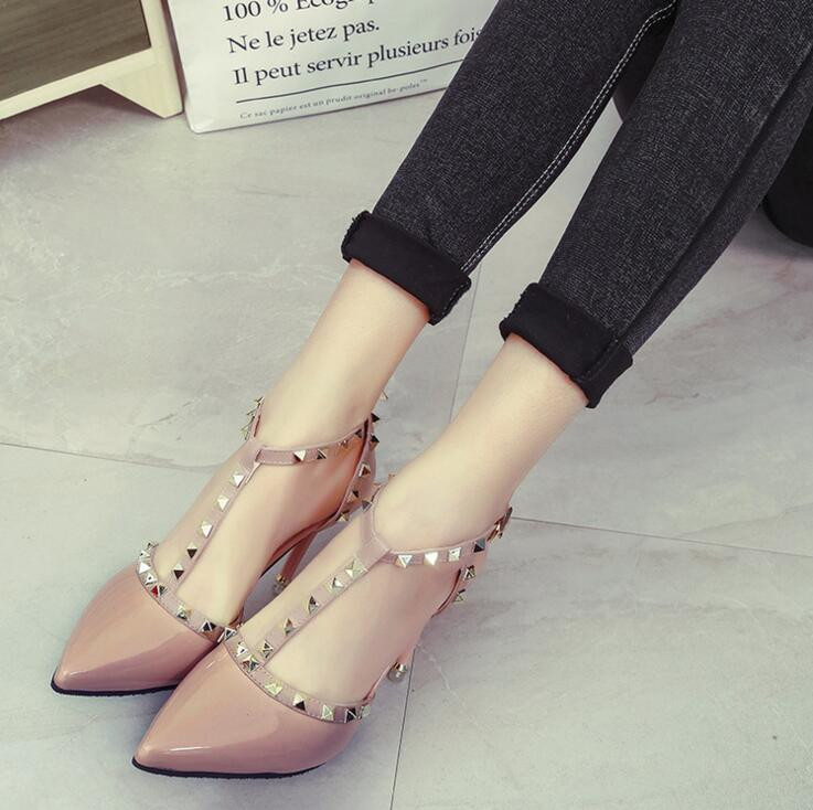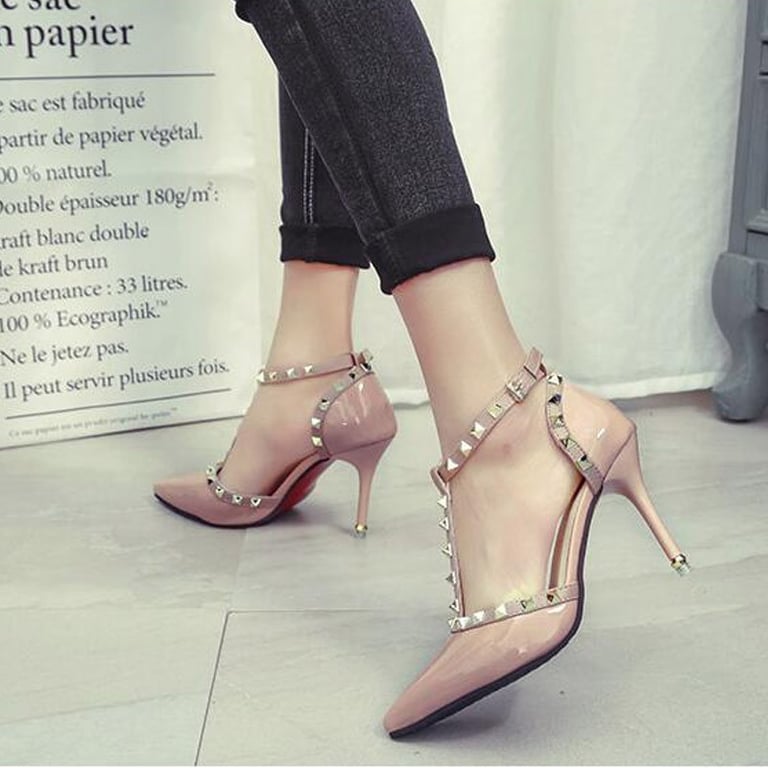 Stylish women's court shoes with a patent finish. Straps with buckle fastening and decorative studs. Heel height 8 cm. Available in several variants.