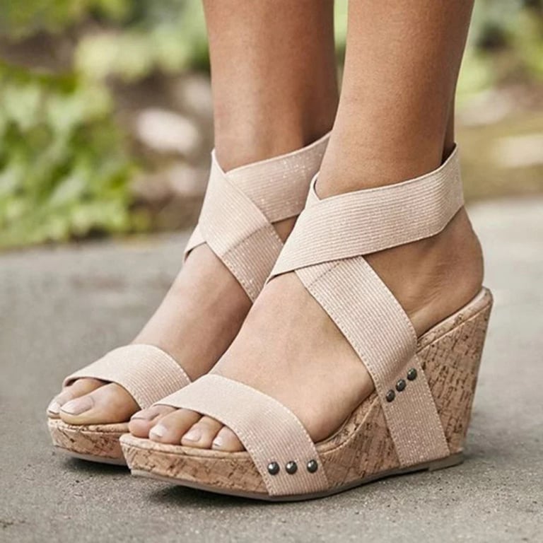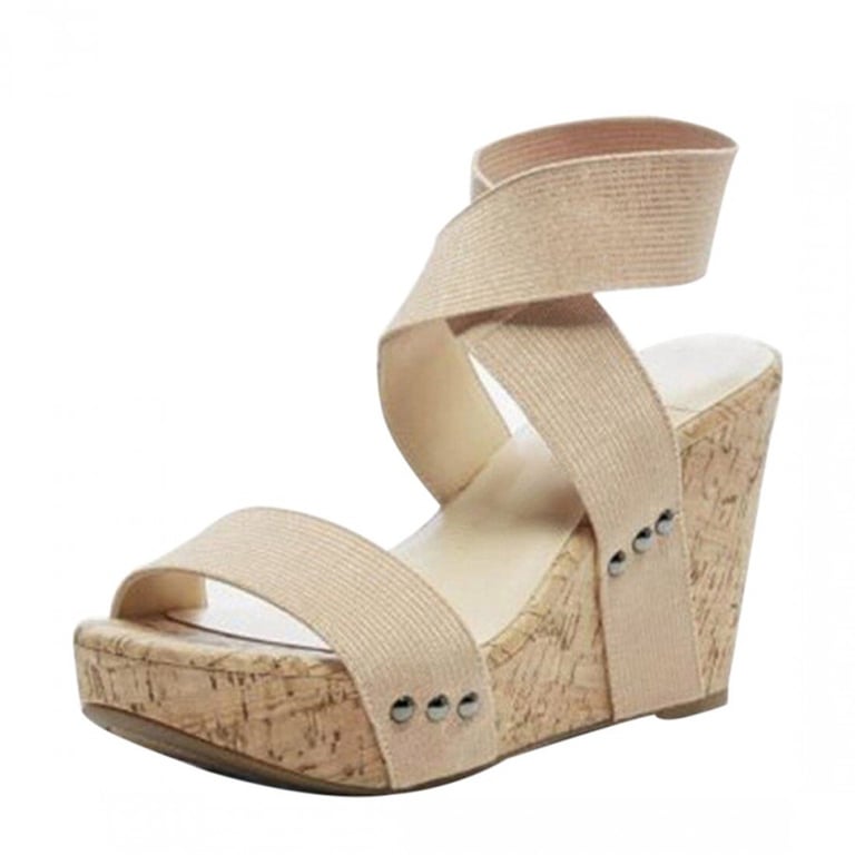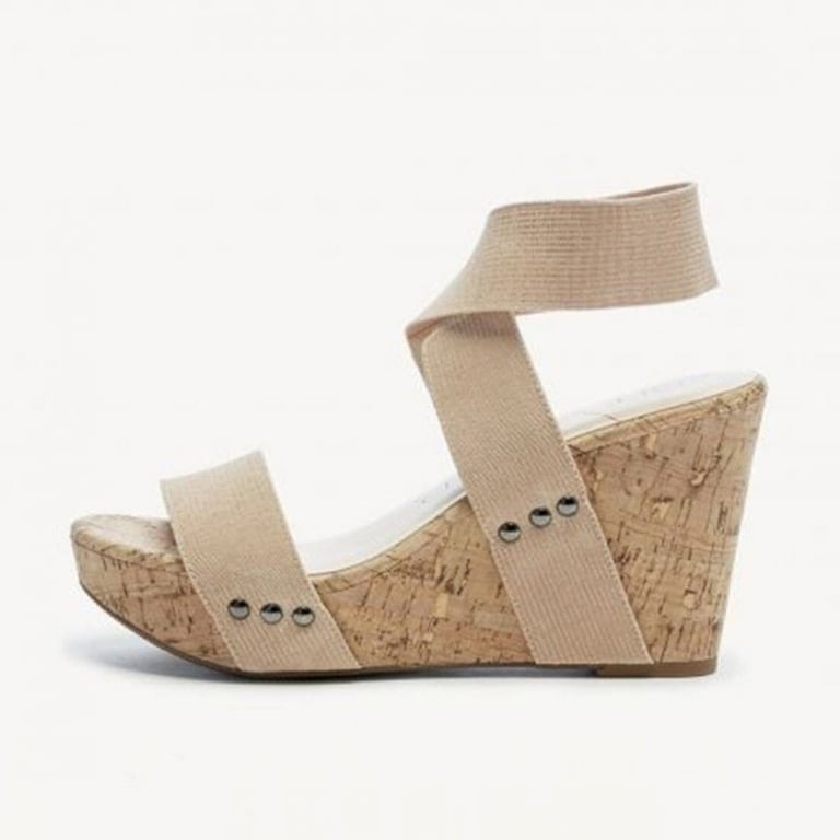 Women's sandals on a high cork platform. The sandals feature elastic straps across the instep and ankles. Available in two colours.