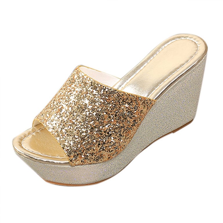 Stylish and very elegant platform slippers with a glittery decoration. Pair them with 3/4 jeans and you'll be stylish.