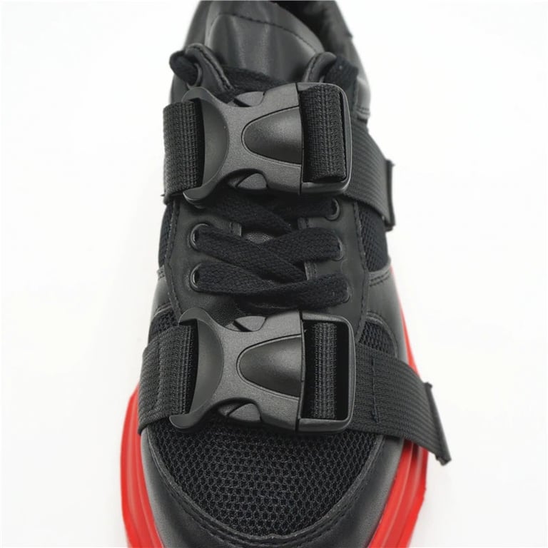 The sneakers lace up with laces and a buckle.