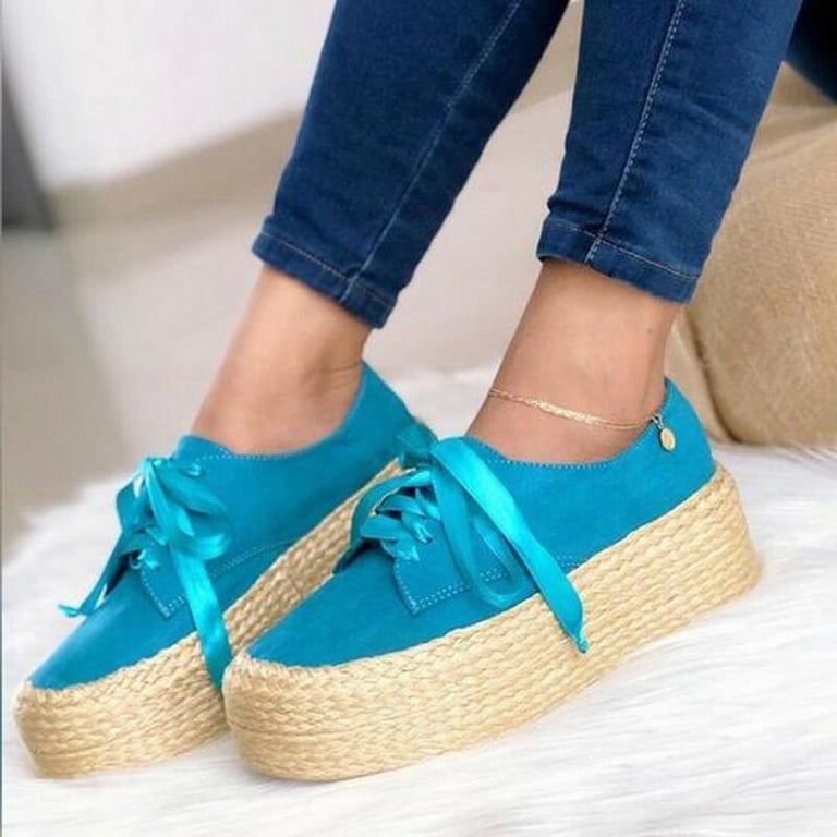 Women's trainers with satin laces. Round toe. Straw sole with a high platform. Available in multiple colour options.