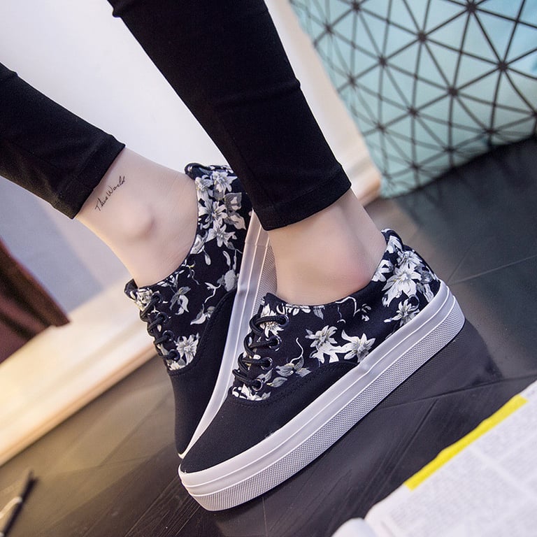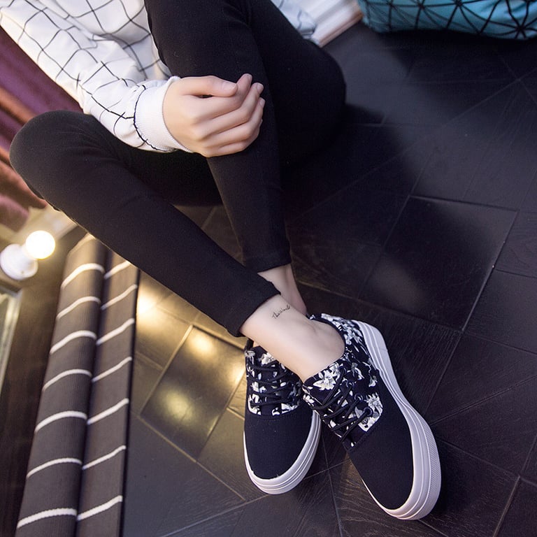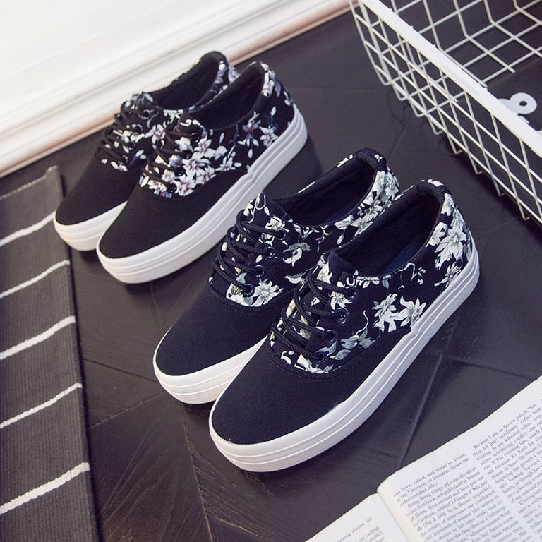 Women's canvas trainers with a floral print. Flat rubber sole with a platform. Laced fastening. Available in two variants.