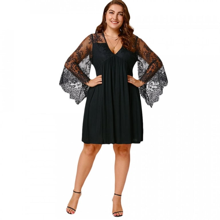 Women's plus size evening dress with wide lace sleeves adorned with lace. The dress features a loose wide skirt that reaches the knees and a V-neckline.