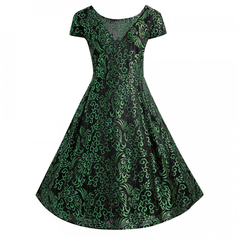 Women's dress with patterned print. The dress features a V-neck, short sleeves, and a long wide skirt. Available in several colour options.