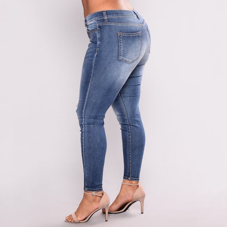 Women's blue denim trousers with distressing and light fading. The trousers have a mid-rise waist. Comfortable stretchy material. Available in plus sizes.