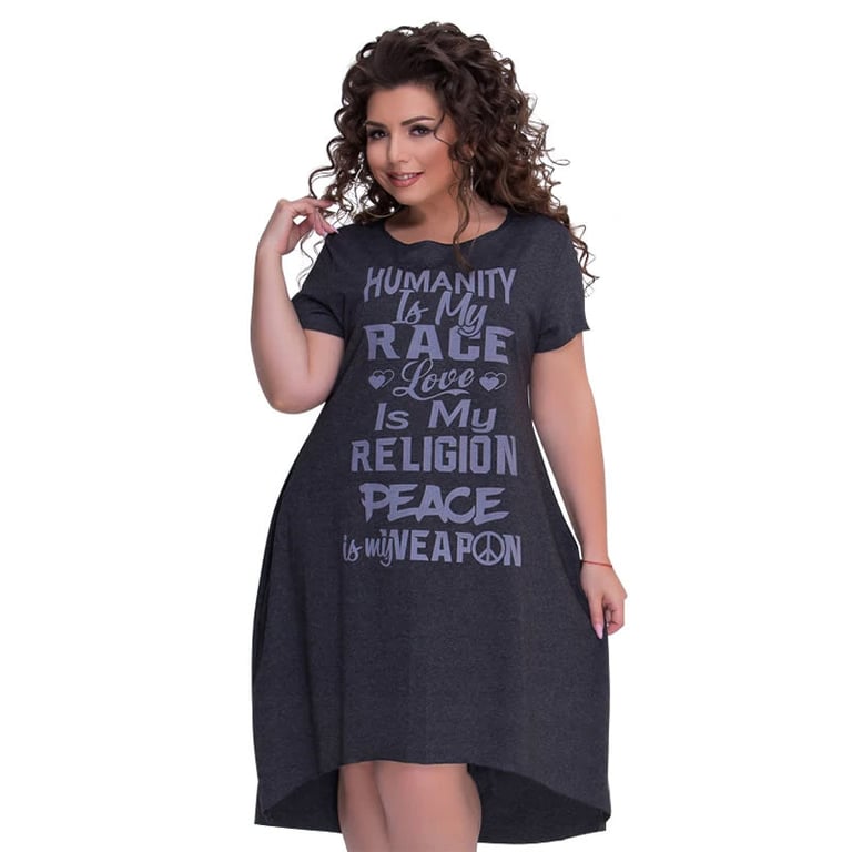 Women's casual short-sleeved dress. Loose, comfortable fit in plus size. Solid colour with black print. Available in several colours.
