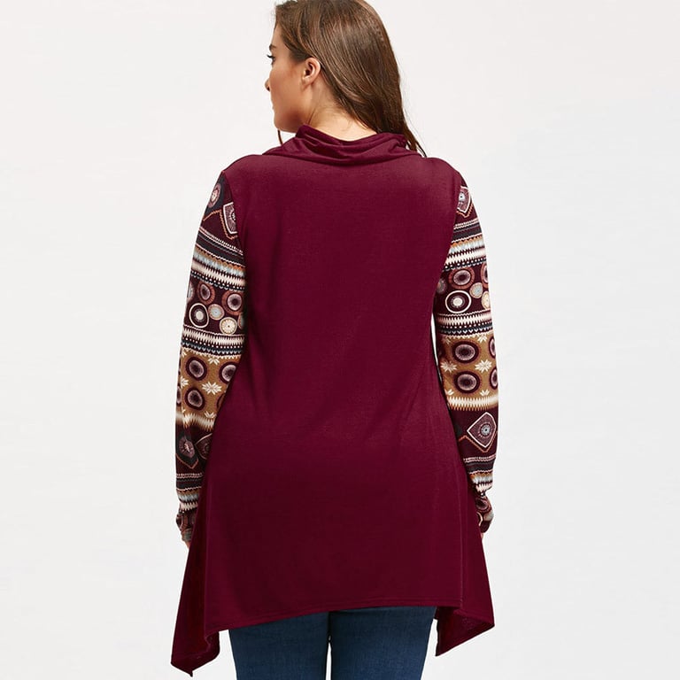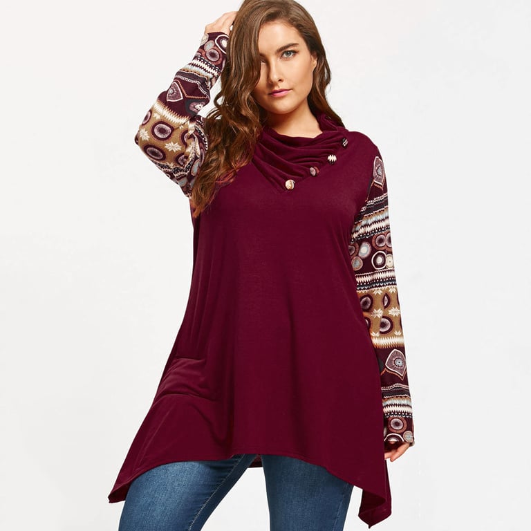 Women's plus size sweatshirt with an asymmetrical cut. The sleeves feature a colourful pattern and the neckline has a collar adorned with buttons. Available in two colours.