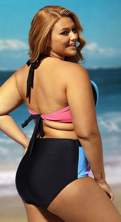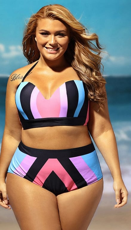 Plus size bikinis with a high waist in pastel colours.