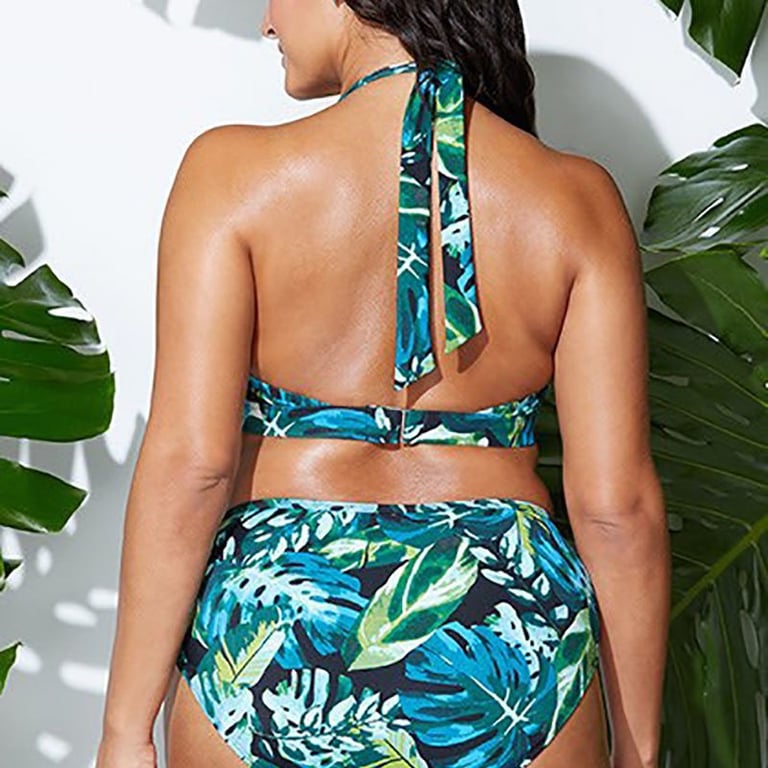 Women's two-piece swimsuit with straps that tie at the neck and a V-neckline. The bottom has a medium-high waist and a slight cutout. Leaf pattern print. Available in plus sizes.