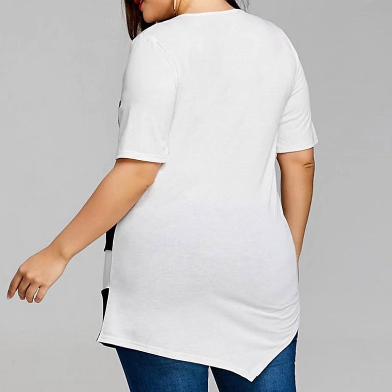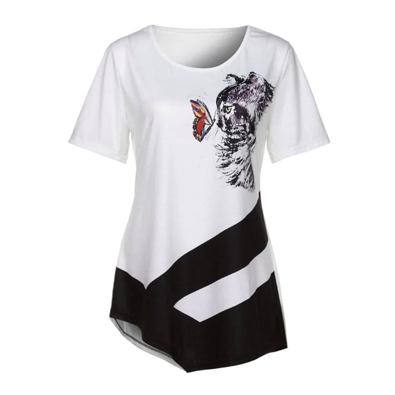 Women's plus size short-sleeve t-shirt. Asymmetrical cut and round neckline. Featuring a cat print and trimmed with a black stripe.