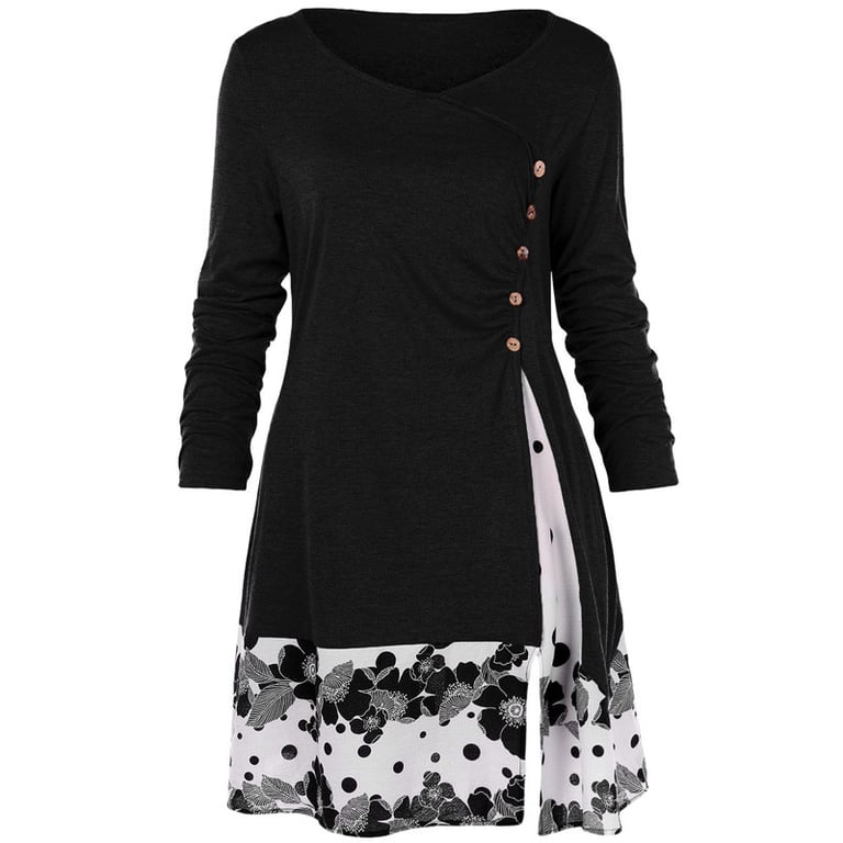 Women's tunic blouse with long sleeves and a round neckline. Decorative buttons on the front. Floral print section. Plus size available. Available in multiple colour options.