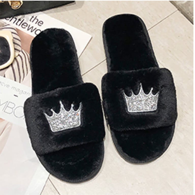 Stylish women's plush slippers with a sparkling crown. Comfortable slippers that are the perfect choice for home or work.