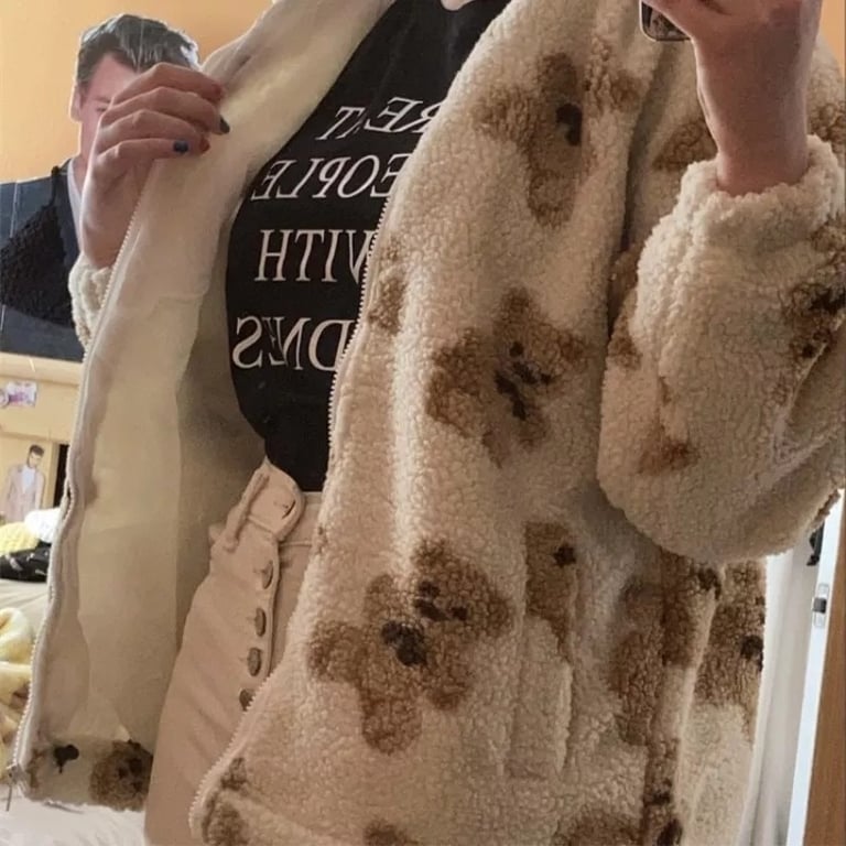 Women's plush wool zip-up hoodie with a cartoon bear design.