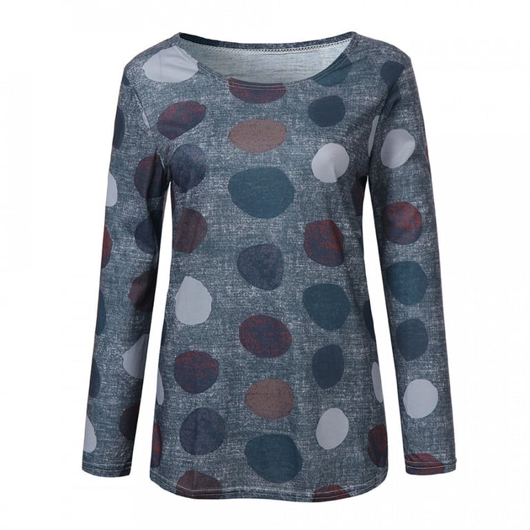 Women's long-sleeve t-shirt with a round neckline. Comfortable, pleasant material. Straight cut. The t-shirt features a polka dot print. Plus size available. Available in several variants.