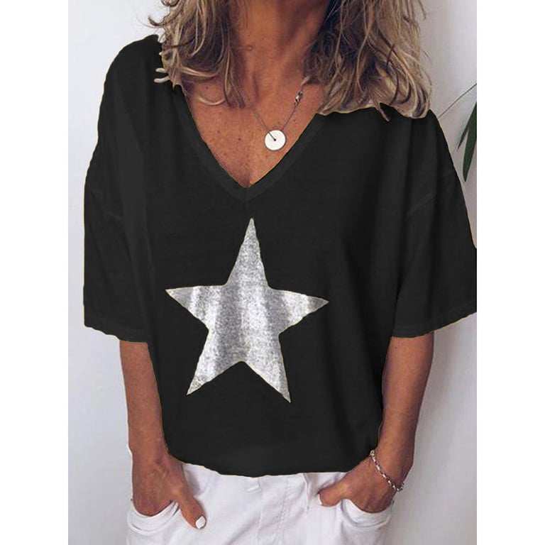 Women's top with short flared sleeves and a V-neckline. Loose fit with a shiny print on the front. Available in multiple colour options.