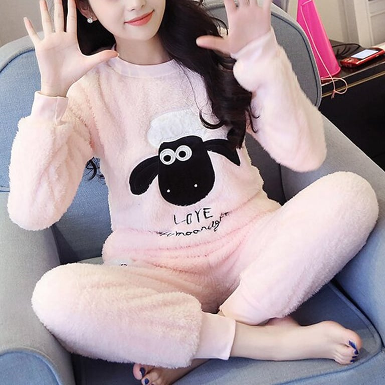 Women's warm fluffy pyjamas. Top with long sleeves. Trousers with long legs and an elasticated waistband.