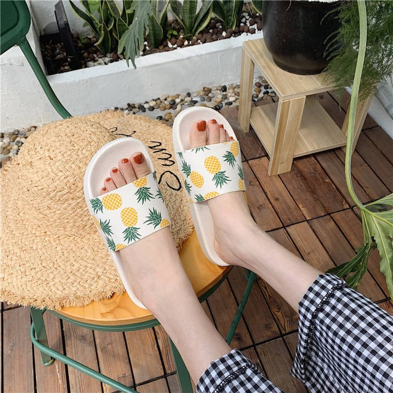 Women's rubber slippers with a pineapple motif. Flat sole and open toe. Available in two colour variations.