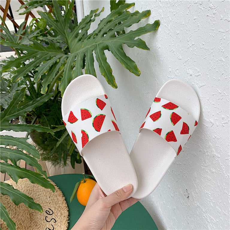 Women's rubber slippers with a watermelon motif. Flat sole and open toe. Available in two colour variations.