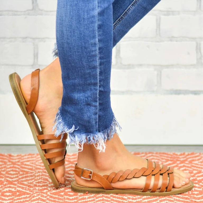 Women's strappy sandals with an open toe and heel. Woven strap across the instep. Buckle fastening. Flat sole. Available in multiple colour options.