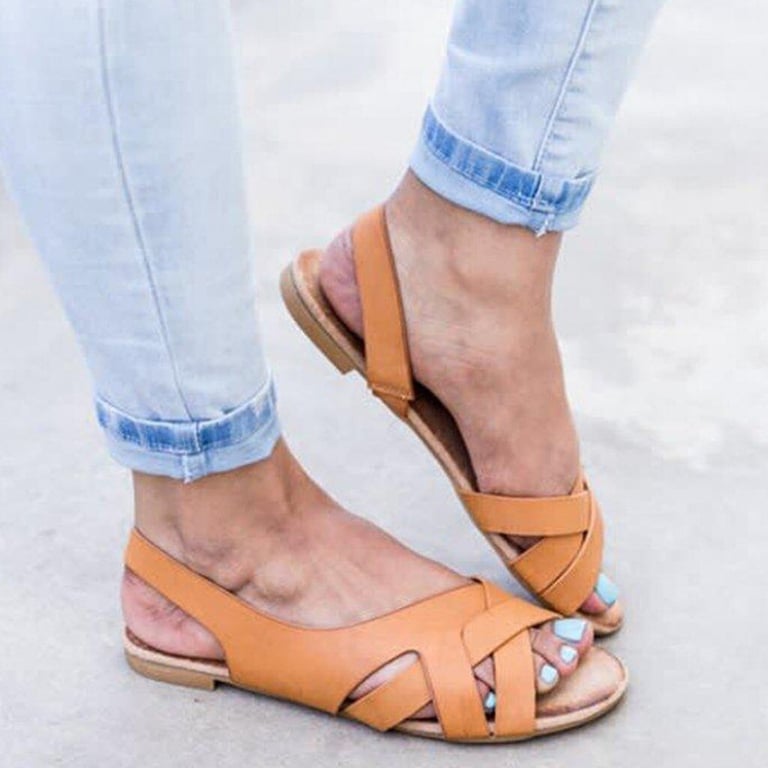 Women's strappy sandals with an open toe and heel. Made of faux leather. Flat low sole. Available in multiple colour options.