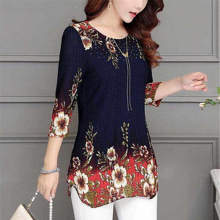 Women's shirt blouse with a round neckline. The blouse has a loose fit and three-quarter sleeves. Subtle side slits. Colourful floral print. Available in two variants.