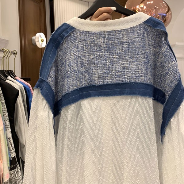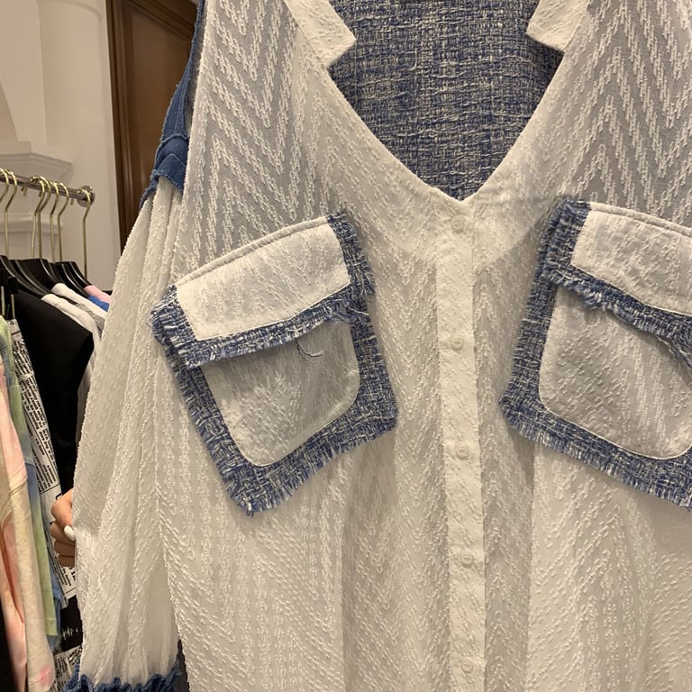 Stylish women's shirt. It has long loose sleeves and is adorned with two small pockets.