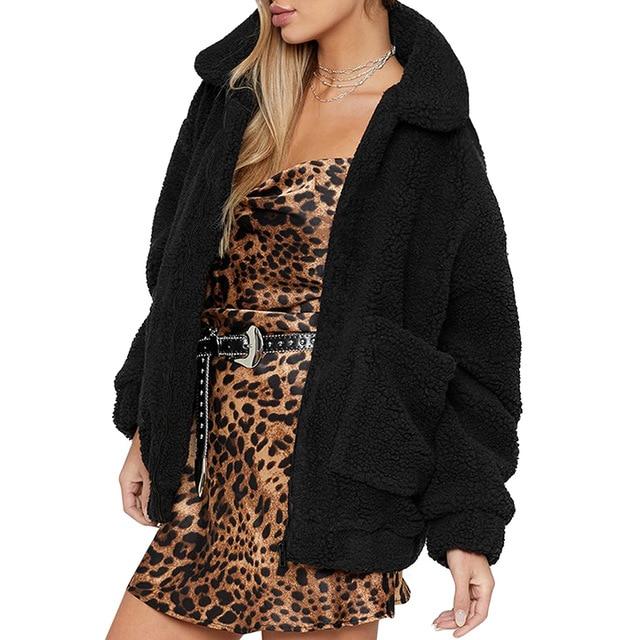 Women's short fur coat with a zip, featuring a collar and pockets, suitable for everyday wear.