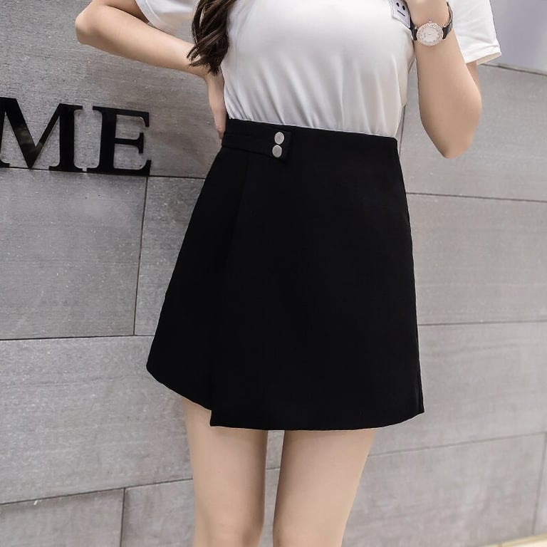 Women's short A-line skirt. Wrap-around with a strap detail at the waist. Available in two colour options.