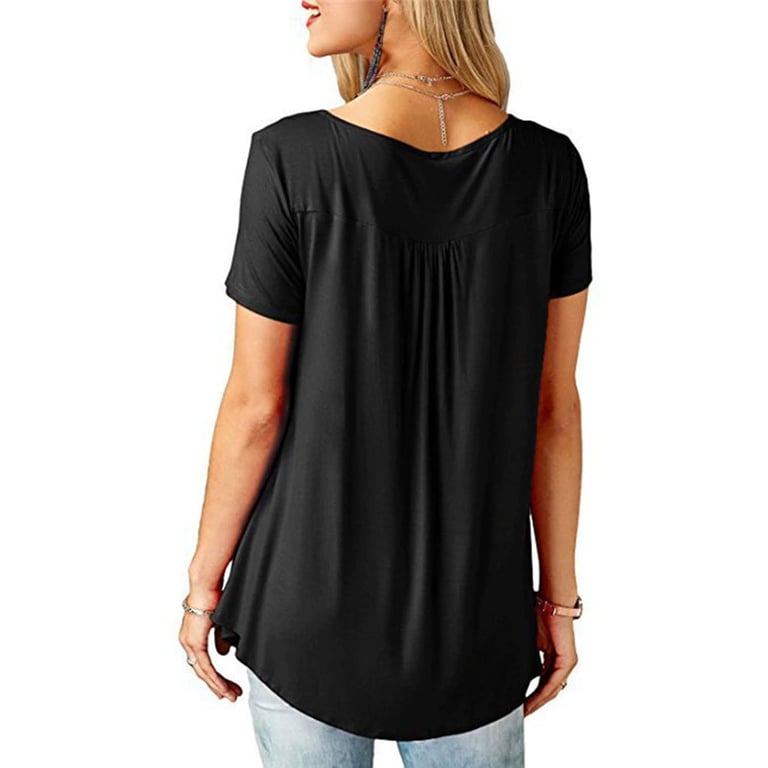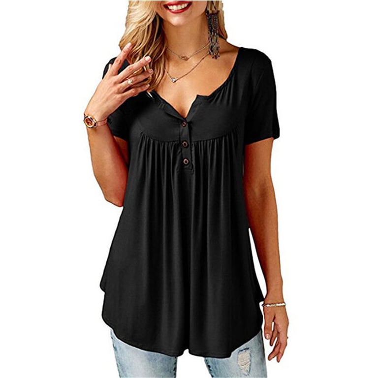 Women's loose-fitting top/t-shirt with gathering. The t-shirt features a round neckline with button fastening and short sleeves. Made from a pleasant, airy material. Available in plus sizes. Choose from multiple colour options.