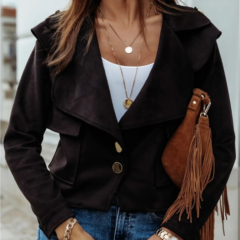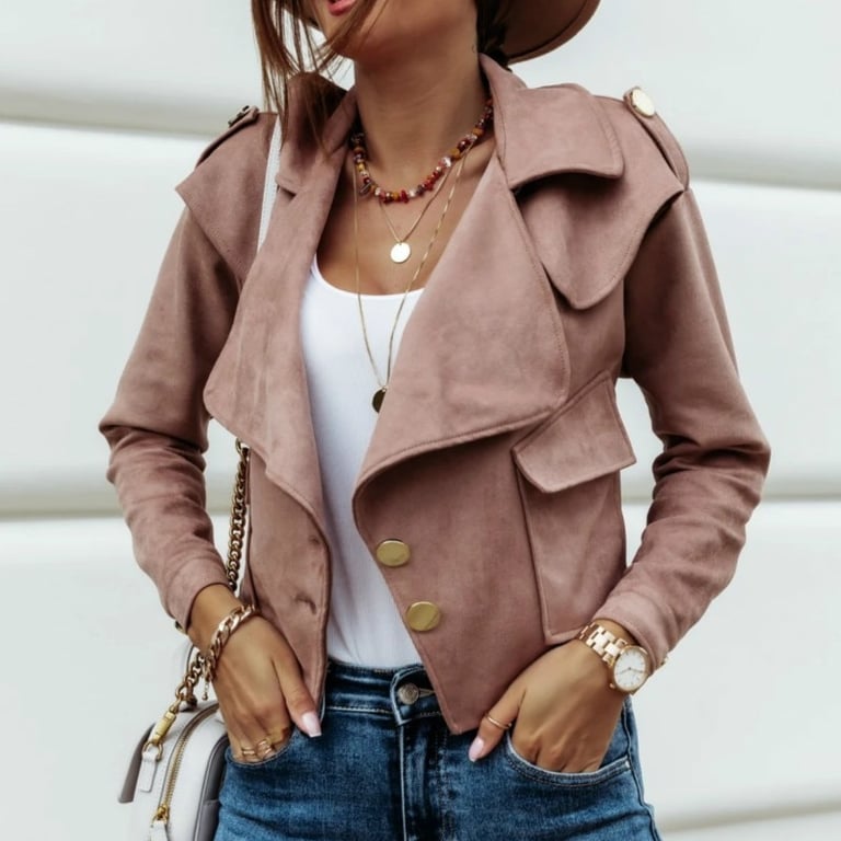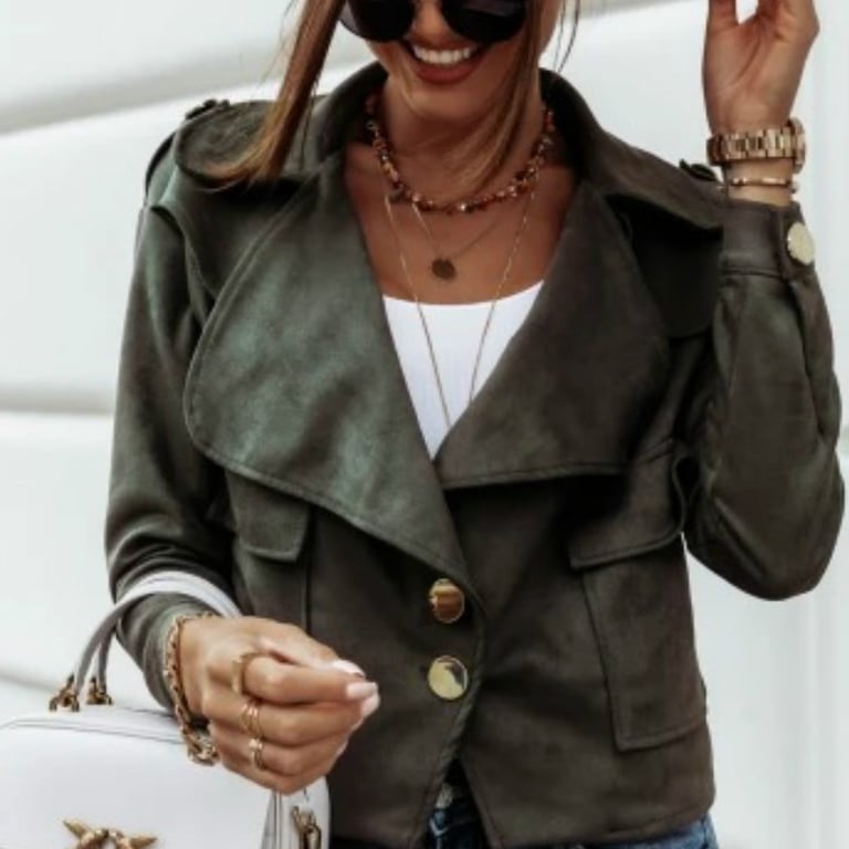 With a larger, foldable collar, fastening with decorative buttons, and larger pockets.