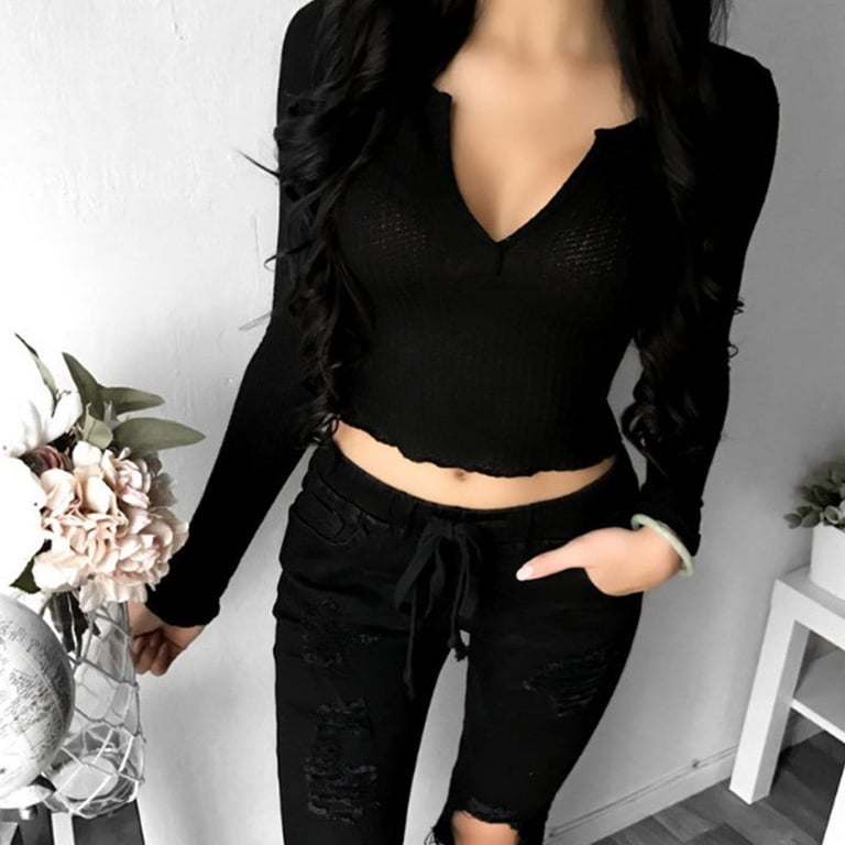 Short sweater with a deep neckline. It has long sleeves. Made from a comfortable material and easy to combine.