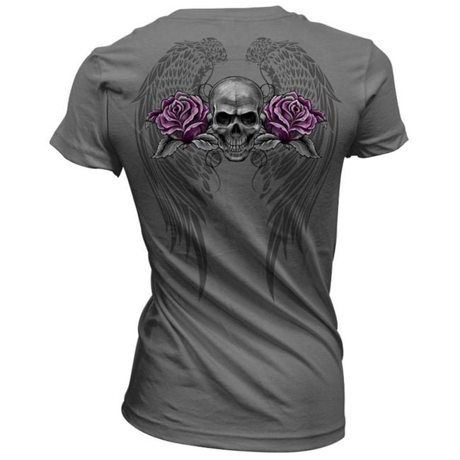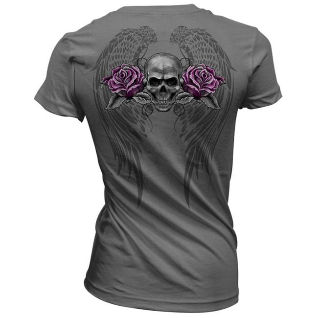 The women's t-shirt is decorated with a skull. Available in grey.