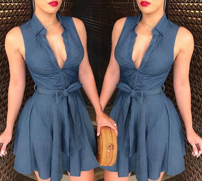 Short women's dress with a deep neckline.