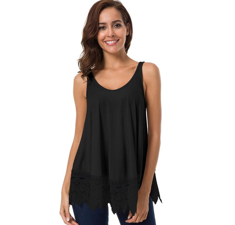Women's sleeveless top with straps and a round neckline. Loose comfortable fit with decorative lace. Available in multiple colour options.