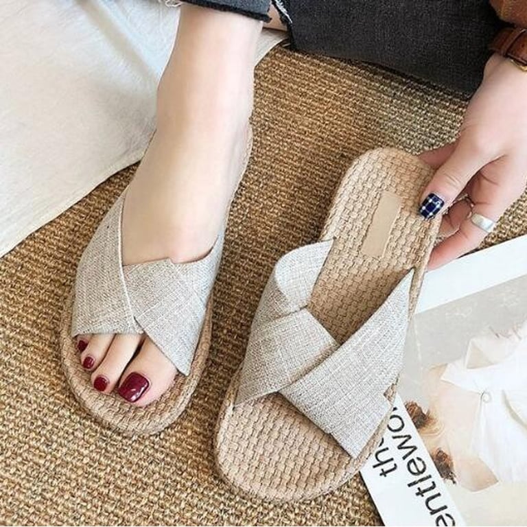Women's slippers with wide straps. Open toe and heel. Flat sole. Available in multiple colour options.