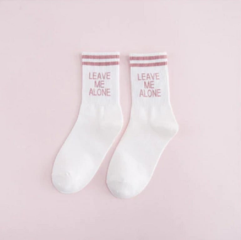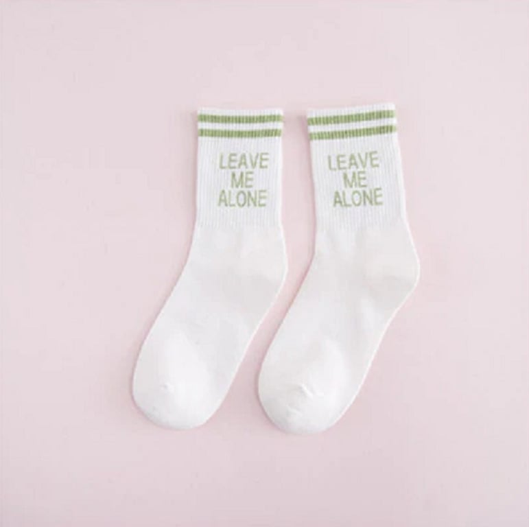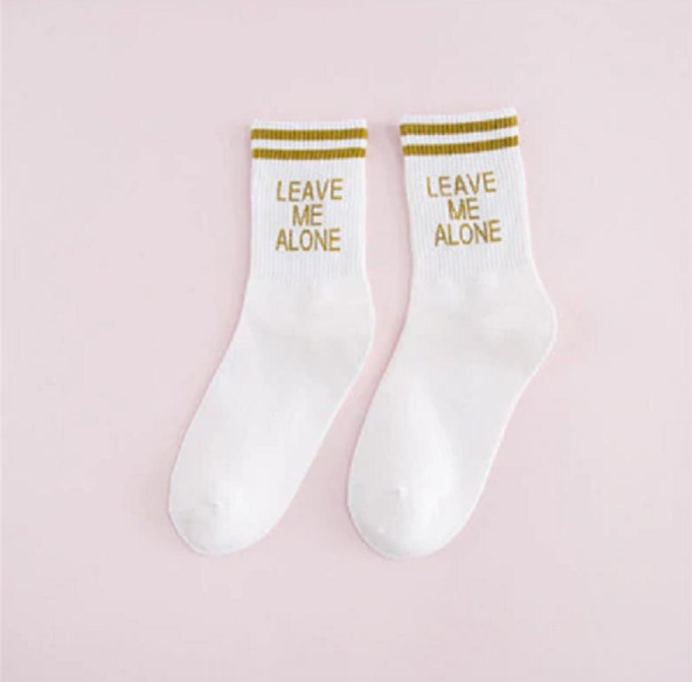 Socks with the funny slogan "Leave me alone."